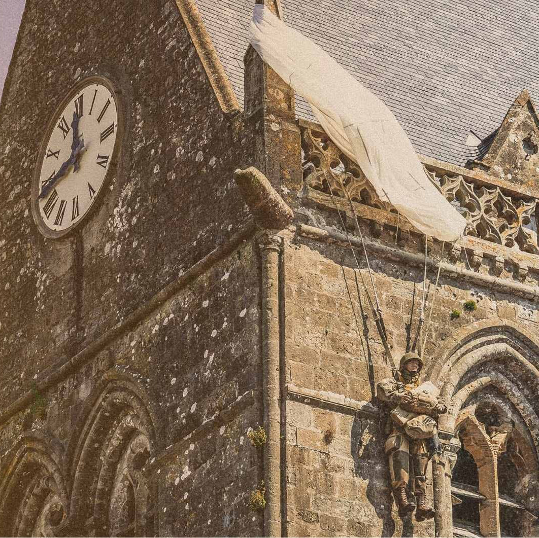 Elle est également connue pour un épisode peu commun. Lors de la Seconde Guerre mondiale, des parachutistes américains atterrissent par erreur dans le village. C’est à ce moment-là que l’un d’eux, John Steele, se retrouve accroché au clocher de l’église lors de sa descente. Il y restera suspendu pendant deux longues heures, tandis que les combats font rage au sol.