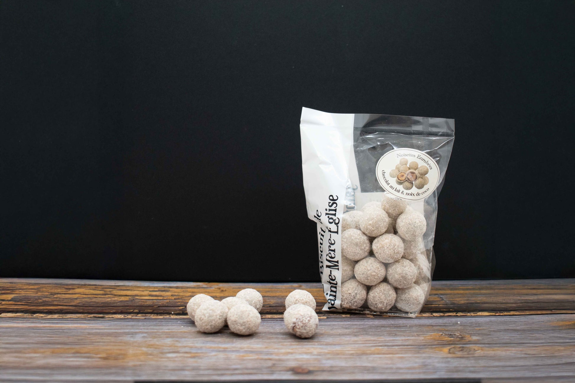 Un délicieux mariage de saveurs : des noisettes croquantes, enrobées d’un chocolat fondant (38,2 % de cacao), délicatement roulées dans de la noix de coco râpée. Une gourmandise à la fois généreuse et subtile, qui évoque à chaque bouchée le savoir-faire artisanal de notre biscuiterie normande.