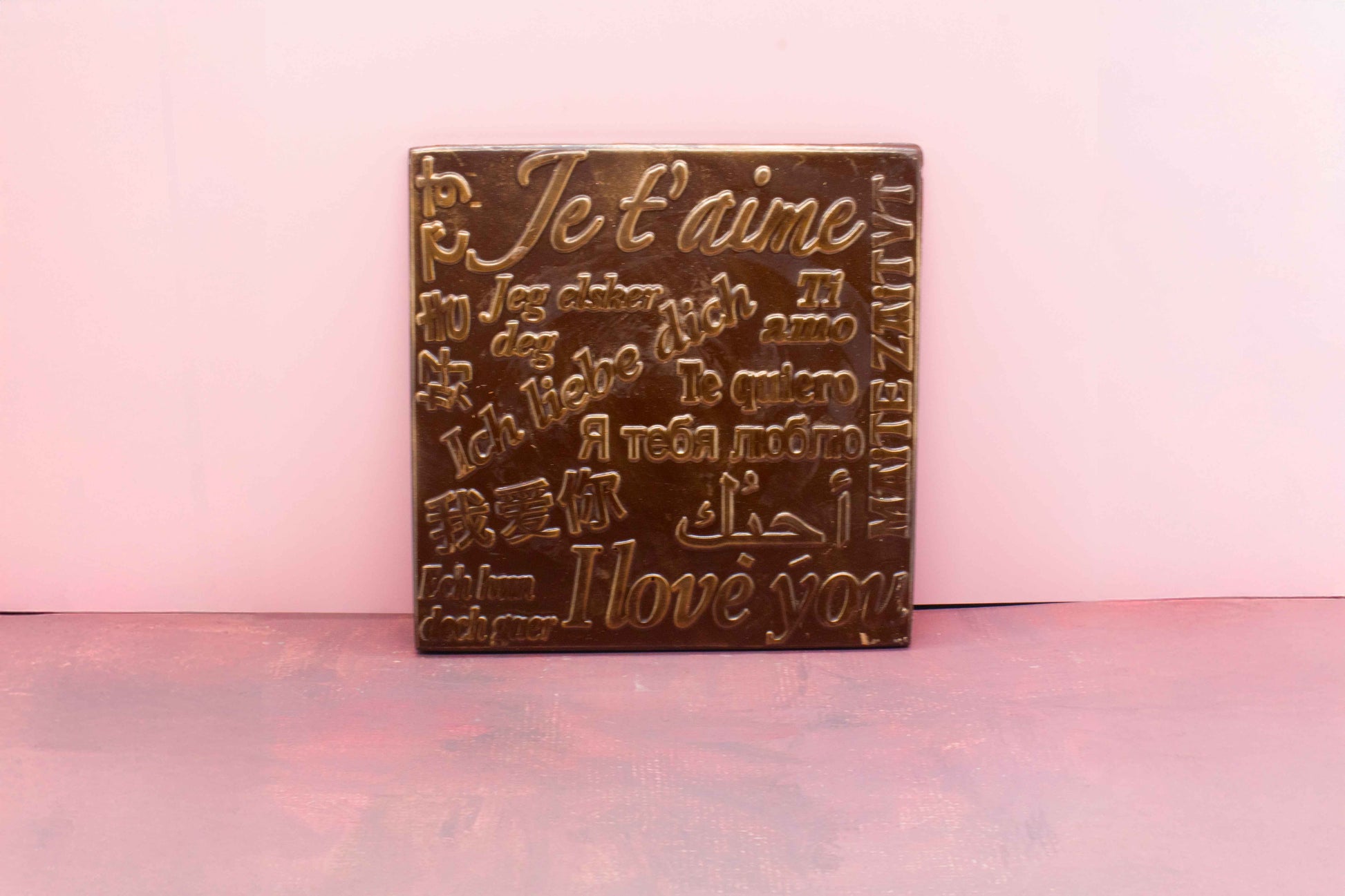 Dites je t’aime de la plus gourmande des façons avec notre tablette de chocolat noir 130 g, délicatement décorée de l’inscription « Je t’aime » dans toutes les langues. Une création pleine de sens, pensée pour célébrer l’amour à l’occasion de la Saint-Valentin.